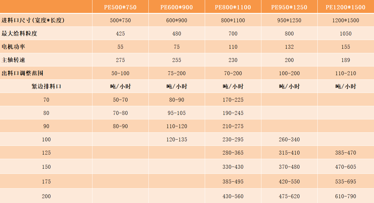 PE系列顎式破碎機(jī)型號(hào)及技術(shù)參數(shù):